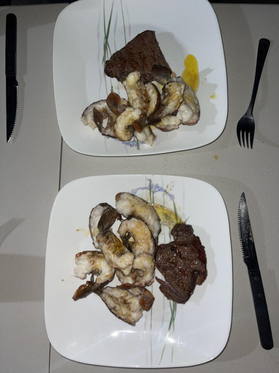 So with a small amount of assistance from Jayne, we had a great River and Turf meal. The Red Claw was prepared with garlic and butter and cooked on the Weber. The taste was great, and really as good as lobster.