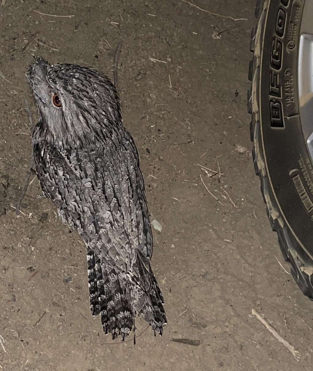 With another thump a Tawny Frogmouth landed just under the light, right next to us. They're a magnificent bird, and so well camouflaged in the trees.