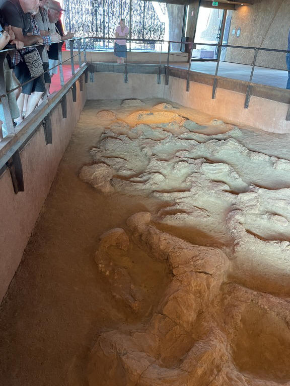 It all started when they discovered these tracks in a river bed that was uncovered during a flood in 2006. They painstakingly moved the whole river bed, about 50m long. This was to stop further corrosion occurring. They couldn't preserve it where it was found. Whereas at Lark Quarry, they built the air-conditioned building around the actual site and continue to work on uncovering it in situ under this protected area.