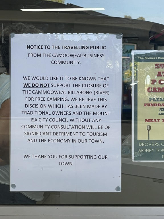 A lot of tourists are saying they will bypass Camooweal now which will destroy the businesses there. You can see from the sign on the service station door that the local businesses aren't in favour of it.