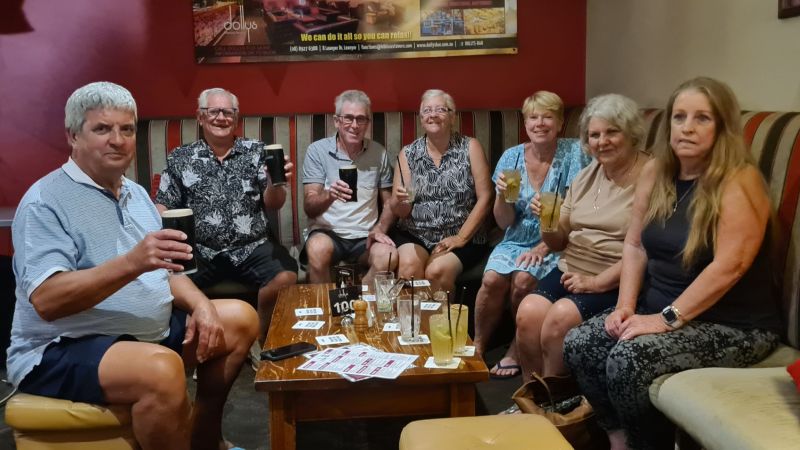With the girls and their cocktails - L-R Alan, Merv, Chuck, Sue, Jayne, Jen and Jane