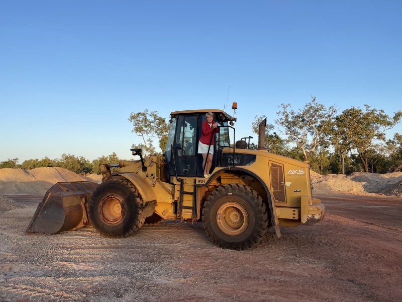 Being a road works gravel pit, Alan and Jayne found some equipment during our morning walk. Of course Jayne just had to climb on it!