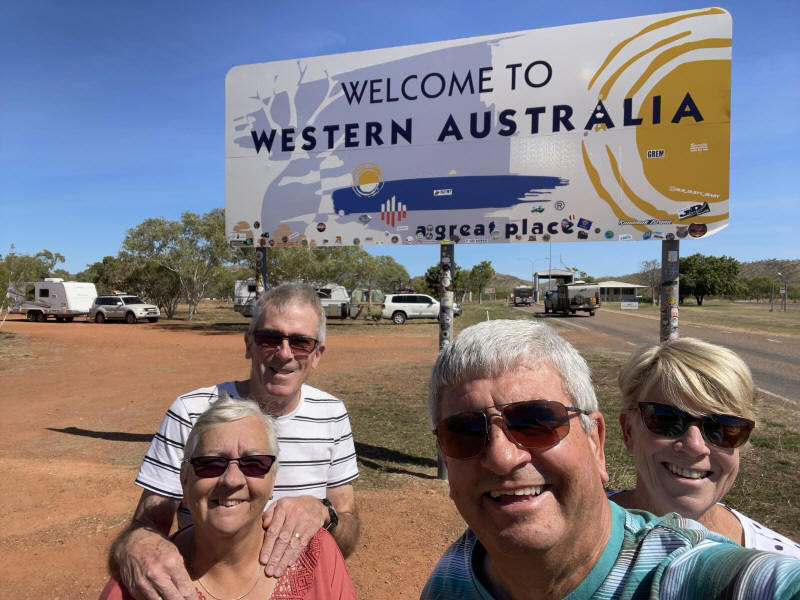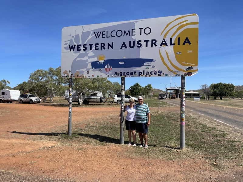 Finally at the Western Australia border, ready for our border search a few metres away. We had cleaned out our vans and eaten as much fruit and veggies as we could. Sue gave up her honey, and we handed over a Woolies sealed packet of salad leaves. They're absolutely ruthless, and made the guy in front of us hose down his camper because of the chance of seeds or other suspect things caught up in the dried mud on his vehicle.