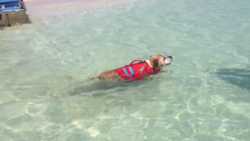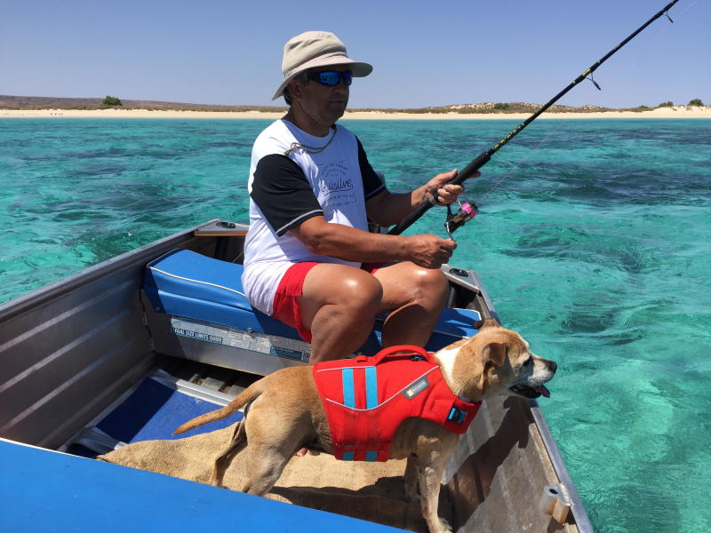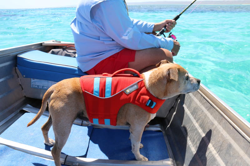 Bailey enjoys fishing, but we've had to leave him behind as he gets too excited when we're casting and we're concerned he'll snap a lure or end up with a mouthful of hooks.