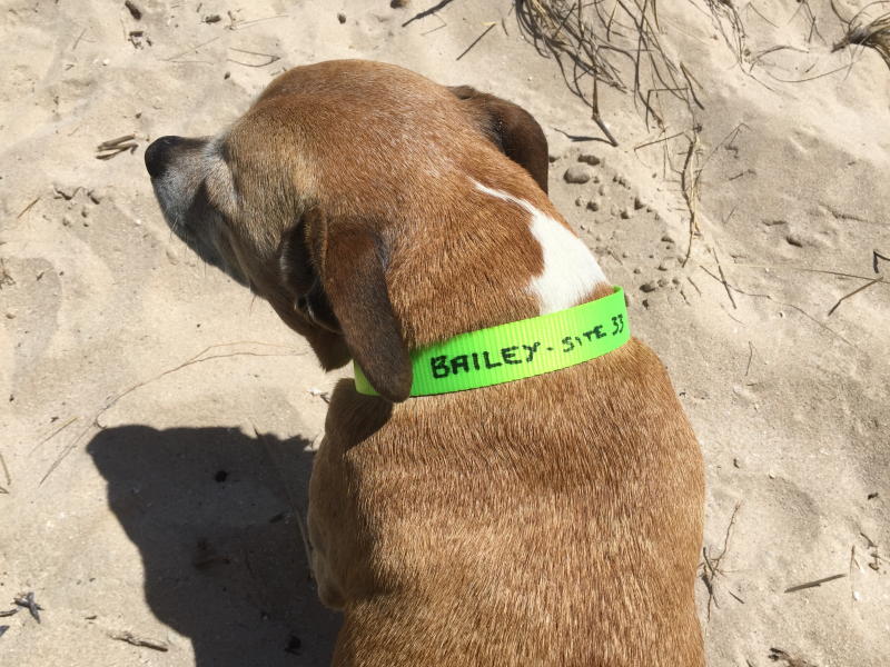 When we leave him to guard our camp, he wears his special homemade Ningaloo identification collar in case he goes walkabout.