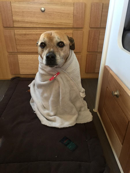 We can't believe how cold it is over here, and we've struck wet weather as well. I didn't think it rained much in Perth. Even Bailey the Pansy Dog was feeling the cold.