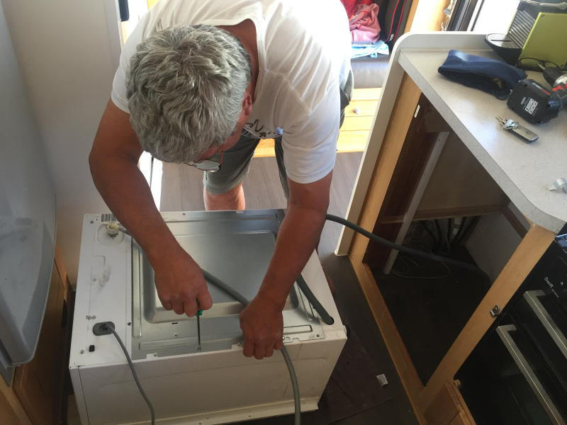 That sounds easy enough, but we couldn't get the machine out of the cupboard. Another call to BushTracker who also didn't know how to get the machine out and asked for photos of where it was mounted. These were sent off, but in the meantime we worked it out, and had to remove the top shelf and the slides. Then tilt the machine forward and through the opening that has max 1 micron clearance on all sides and lift out the machine. This machine weighs 47kgs! If this sounds a little crazy, once we opened up the back, we discovered 2 lumps of concrete inside which keep the machine balanced. With Jayne and I straining ourselves well past our capabilities and in very close quarters!