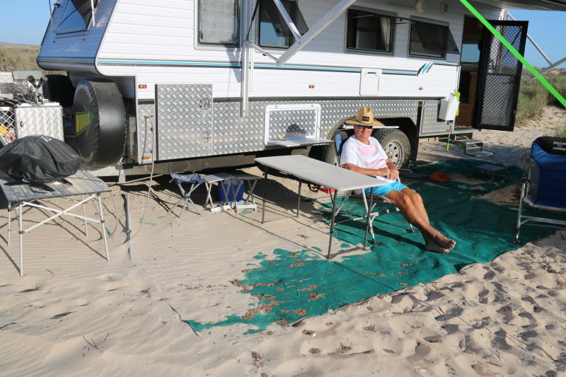 We had a great day out when we drove to Coral Bay on Monday to meet up with our friends from Perth, Roy and Marg. It's a 2 hour drive each way from our camp, including re-inflating the tyres once you get to the bitumen, and then letting them down again once we get back onto the station property. We have a great time with them and definitely worth the trip. Jayne drove back to our camp, and minutes out of Coral Bay and in broad daylight, a kangaroo jumped in front of the car and she creamed him.