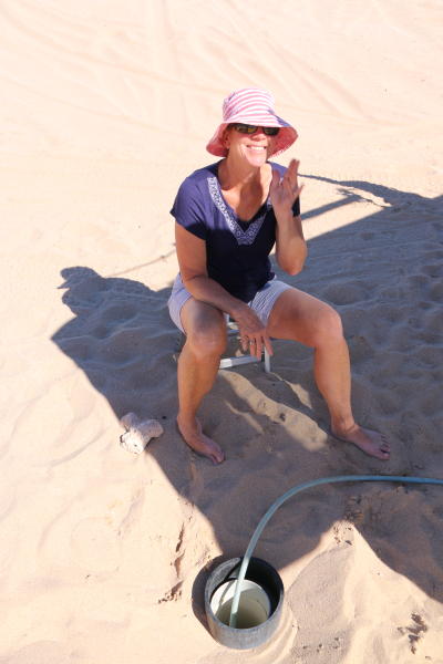 Here we are trying to prime our water pump, we didn't do it correctly but Roy was in his element crawling around in the sand with his head down the well.